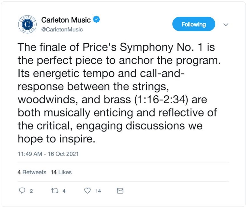 As part of a music course called Smashing the Idols, I took advantage of an alternative assignment opportunity by creating a fake Twitter feed advertising a concert program of my design. The medium is part of the message in this assignment, which takes on a different form and tone than an academic essay while also trying to engage both scholars and the general public. It also incorporates images and references audio. For example, the fake tweet below on the left calls attention to the audio on the right.